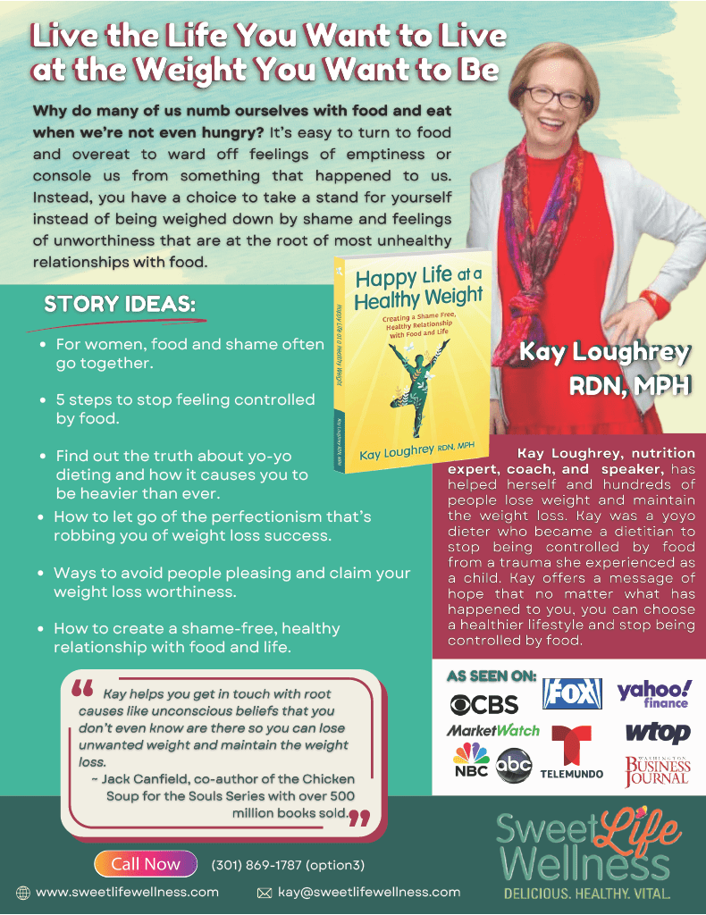 A transformational speaker and industry thought leader, Kay Loughey is often speaking on national and local virtual stages about health and how to build a healthy relationship with food. Her most important message focuses on the sweet spot between food and shame, offering a unique perspective on overcoming food-related challenges.