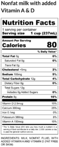 Percent Daily Value (%DV): The FDA states that “the %DV is the percentage of the Daily Value for each nutrient in a serving of the food. The Daily Values are reference amounts (expressed in grams, milligrams, or micrograms) of nutrients to consume or not to exceed each day. The %DV shows how much a nutrient in a serving of a food contributes to a total daily diet.” Take a look at the carbohydrates of the nonfat milk Nutrition Facts label example. According to the %DV, a serving size of that specific milk would provide 4% of the daily calcium requirement/limit based on a 2000 calorie/day diet. It is important to know how to read and interpret this %DV as it can differ with brand and different conditions may require less or more consumption of certain nutrients (i.e. someone with heart disease or high blood pressure may be prescribed a low sodium diet).