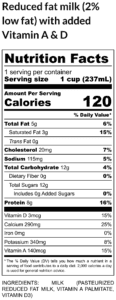 First things first: what information can you find on a Nutrition Facts label? According to the U.S. Food & Drug Administration (FDA), some of the basic information (as shown in the pictures provided) includes: the serving information, the calories, the nutrients, and the percent daily value. Some differences between the old and new label, as stated by the FDA, include: the print of the servings and calories being larger and bolder, the addition of the added sugars section, and a new footnote. As we go through a side-by-side comparison of reduced fat milk (2% low fat) and nonfat milk (sourced by USDA) with this new Nutrition Facts label, we will provide a brief explanation of each of the four components, as well as how that information can be used to help make good food choices and help with weight loss.